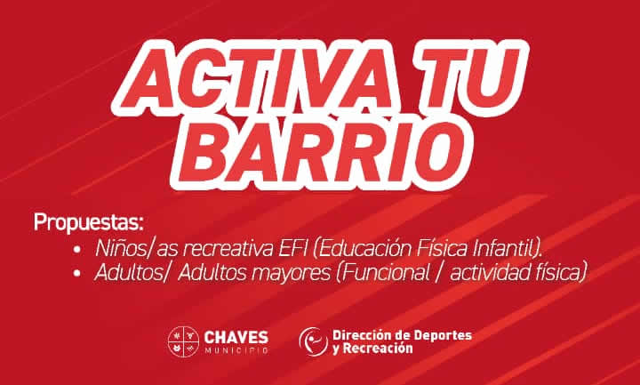 5 La propuesta gratuita, impulsada por la Dirección de Deportes y Recreación de Chaves Municipio, busca promover hábitos saludables y generar espacios de participación para niños, niñas, adultos y adultos mayores.Chaves Municipio, a través de la Dirección de Deportes y Recreación, puso en marcha “Activa Tu Barrio”, un nuevo programa gratuito destinado a acercar propuestas deportivas y recreativas a distintos sectores de la ciudad.La iniciativa tiene como objetivo fomentar la actividad física, promover hábitos saludables y generar espacios de encuentro comunitario, con actividades pensadas para distintas edades y coordinadas por profesores especializados.Las propuestas se desarrollarán en tres sedes:📍 Jardín N° 905 Lunes y miércoles • 18:00 hs: niños y niñas • 19:00 hs: adultos y adultos mayores Profesora: Micaela Díaz📍 Escuela Secundaria N° 4 Martes y jueves • 18:00 hs: adultos mayores Profesor: Chuchu Di Blasio📍 Escuela Primaria N° 8 Lunes y miércoles • 17:00 hs: niños y niñas • 18:00 hs: adultos y adultos mayores Profesora: Florencia GuzmánEntre las actividades se incluyen propuestas recreativas de Educación Física Infantil (EFI) para niños y niñas, además de clases de funcional y actividad física destinadas a adultos y adultos mayores.Desde el Municipio destacaron que “Activa Tu Barrio” busca fortalecer el acceso al deporte y la recreación en cada barrio, entendiendo la actividad física como una herramienta clave para mejorar la salud, el bienestar y la integración comunitaria.