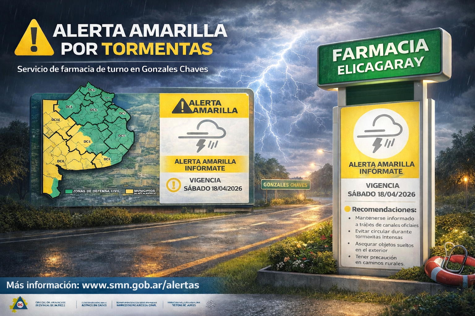 4 El distrito de Adolfo Gonzales Chaves se encuentra bajo seguimiento meteorológico ante la emisión de una alerta amarilla por tormentas que comenzará a regir a partir de la tarde del sábado, afectando también a gran parte de la región.La advertencia incluye a las zonas DC 6 y DC 11, además del oeste de las zonas DC 4, 5 y 7, donde se prevén lluvias y tormentas de variada intensidad, algunas localmente fuertes. Según el informe, los fenómenos podrían estar acompañados por actividad eléctrica frecuente, ráfagas de viento de hasta 70 km/h, abundante caída de agua en cortos períodos y ocasional caída de granizo.Evolución previstaLas tormentas avanzarán de oeste a este, afectando:Sábado por la tarde y noche: zonas DC 6 y DC 11Durante la noche: oeste de las zonas DC 4, 5 y 7Madrugada del domingo: persistencia en el norte de la zona DC 11 y oeste de la zona DC 4Se estiman acumulados de lluvia entre 20 y 50 mm, con posibles registros superiores de forma localizada.Alcance localSi bien la alerta es de carácter regional, Gonzales Chaves queda comprendido dentro del área de influencia, por lo que se recomienda extremar precauciones ante la posibilidad de impactos locales.Nivel de alertaEl nivel amarillo implica la probabilidad de fenómenos meteorológicos con capacidad de daño y de interrupción momentánea de actividades cotidianas.Farmacia de turnoSe recuerda a la comunidad que durante la noche de hoy y hasta las 8:30 horas de mañana, se encuentra de turno la Farmacia Eliçagaray, garantizando la atención ante cualquier necesidad.RecomendacionesMantenerse informado a través de canales oficialesEvitar circular durante tormentas intensasAsegurar objetos sueltos en el exteriorTener precaución en caminos ruralesLas autoridades recomiendan seguir la evolución del fenómeno, ya que las condiciones podrían cambiar rápidamente en las próximas horas.