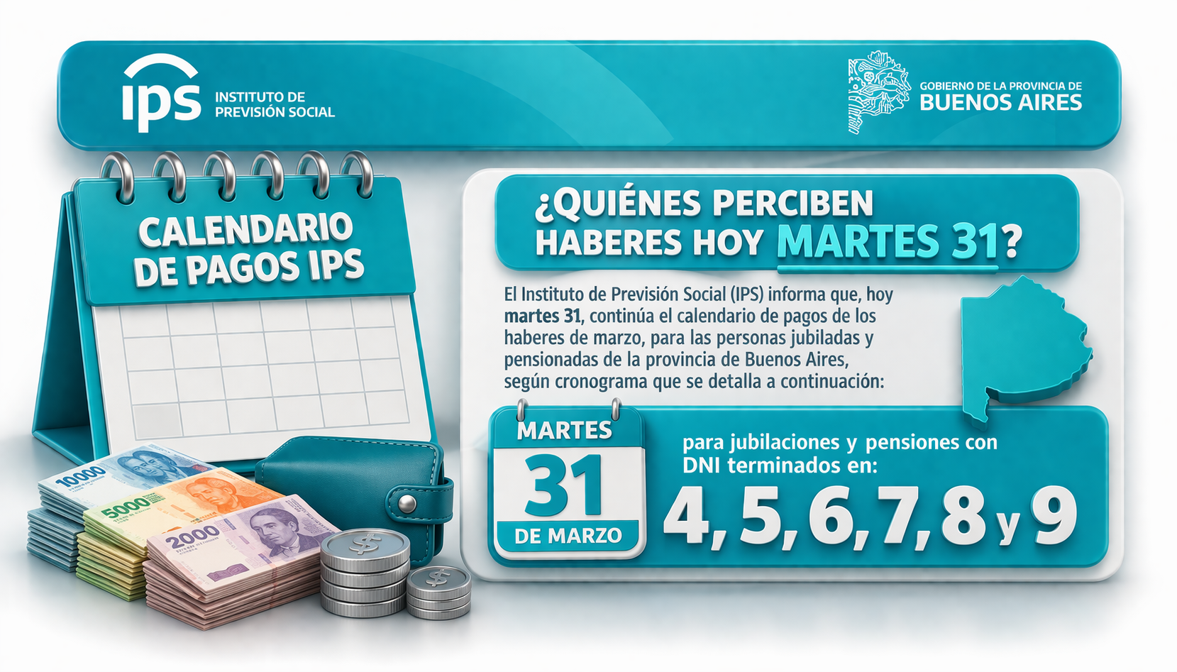 0 ¿Quiénes perciben haberes hoy martes 31?El Instituto de Previsión Social (IPS) informa que hoy, martes 31 de marzo, continúa el calendario de pagos correspondiente a los haberes del mes de marzo, destinado a jubiladas, jubilados, pensionadas y pensionados de la provincia de Buenos Aires.En esta jornada, perciben sus haberes las personas cuyos DNI finalizan en 4, 5, 6, 7, 8 y 9.Asimismo, el organismo previsional recuerda que el plazo para el cobro por ventanilla se extenderá hasta el 23 de abril de 2026.