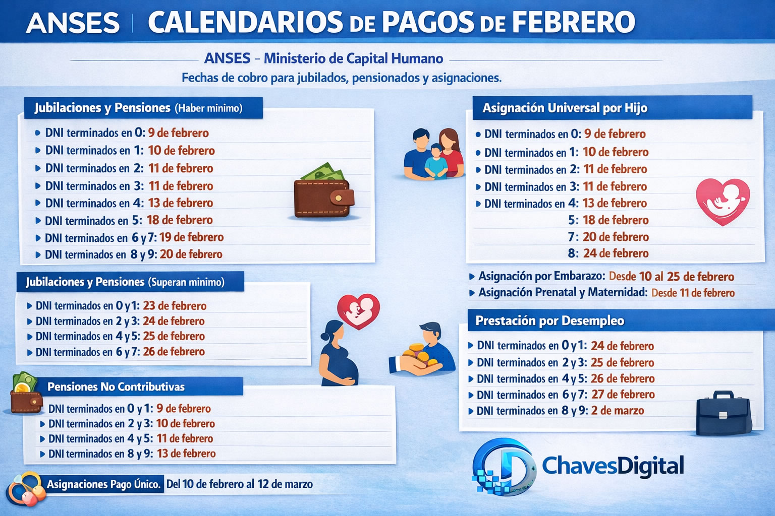 33 ANSES, organismo dependiente del Ministerio de Capital Humano, comunica los calendarios de pagos de febrero para jubilados, pensionados y titulares de Pensiones No Contributivas, Asignación Universal por Hijo, Asignación por Embarazo, por Prenatal, por Maternidad, Asignaciones Familiares, de Pago Único y Prestación por Desempleo.Jubilaciones y pensiones que no superen un haber mínimoDNI terminados en 0: 9 de febreroDNI terminados en 1: 10 de febreroDNI terminados en 2: 11 de febreroDNI terminados en 3: 12 de febreroDNI terminados en 4: 13 de febreroDNI terminados en 5: 18 de febreroDNI terminados en 6 y 7: 19 de febreroDNI terminados en 8 y 9: 20 de febrero Jubilaciones y pensiones que superen un haber mínimoDNI terminados en 0 y 1: 23 de febreroDNI terminados en 2 y 3: 24 de febreroDNI terminados en 4 y 5: 25 de febreroDNI terminados en 6 y 7: 26 de febreroDNI terminados en 8 y 9: 27 de febreroAsignación Universal por Hijo y Asignación Familiar por HijoDNI terminados en 0: 9 de febreroDNI terminados en 1: 10 de febreroDNI terminados en 2: 11 de febreroDNI terminados en 3: 12 de febreroDNI terminados en 4: 13 de febreroDNI terminados en 5: 18 de febreroDNI terminados en 6: 19 de febreroDNI terminados en 7: 20 de febreroDNI terminados en 8: 23 de febreroDNI terminados en 9: 24 de febreroAsignación por EmbarazoDNI terminados en 0: 10 de febreroDNI terminados en 1: 11 de febreroDNI terminados en 2: 12 de febreroDNI terminados en 3: 13 de febreroDNI terminados en 4: 18 de febreroDNI terminados en 5: 19 de febreroDNI terminados en 6: 20 de febreroDNI terminados en 7: 23 de febreroDNI terminados en 8: 24 de febreroDNI terminados en 9: 25 de febrero Asignación por Prenatal DNI terminados en 0 y 1: 11 de febreroDNI terminados en 2 y 3: 12 de febreroDNI terminados en 4 y 5: 13 de febreroDNI terminados en 6 y 7: 18 de febreroDNI terminados en 8 y 9: 19 de febrero Asignación por MaternidadTodas las terminaciones de documento: 11 de febrero al 12 de marzo Asignaciones Pago Único (Matrimonio, Nacimiento, Adopción)Todas las terminaciones de documento: 10 de febrero al 12 de marzoPensiones No ContributivasDNI terminados en 0 y 1: 9 de febreroDNI terminados en 2 y 3: 10 de febreroDNI terminados en 4 y 5: 11 de febreroDNI terminados en 6 y 7: 12 de febreroDNI terminados en 8 y 9: 13 de febreroAsignaciones Familiares de Pensiones No ContributivasTodas las terminaciones de documento: 9 de febrero al 12 de marzoPrestación por DesempleoDNI terminados en 0 y 1: 24 de febreroDNI terminados en 2 y 3: 25 de febreroDNI terminados en 4 y 5: 26 de febreroDNI terminados en 6 y 7: 27 de febreroDNI terminados en 8 y 9: 2 de marzo