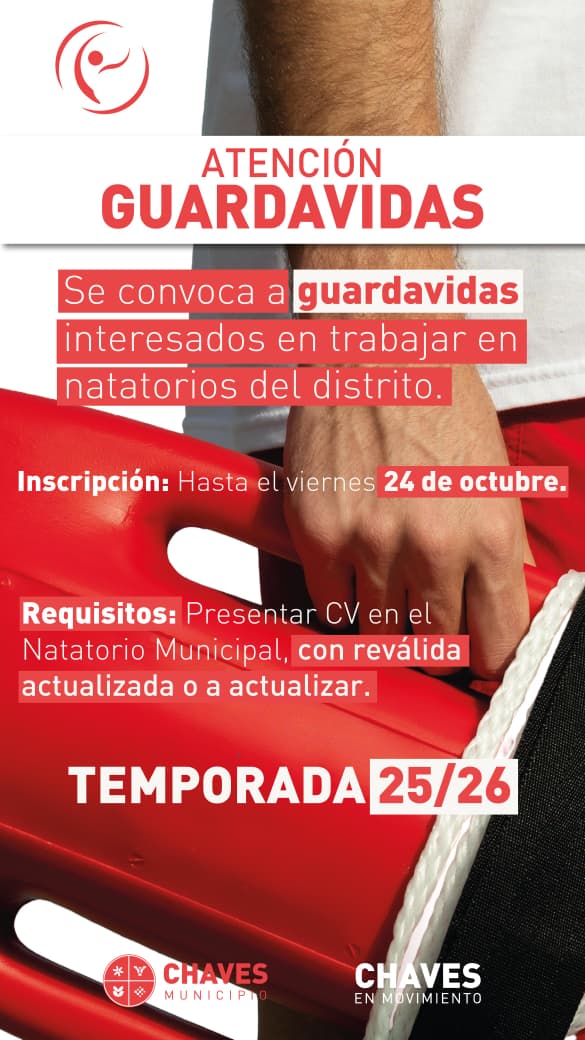 Desde el Natatorio Municipal de Adolfo Gonzales Chaves se convoca a guardavidas interesados en trabajar en los natatorios del distrito durante la temporada 25/26.