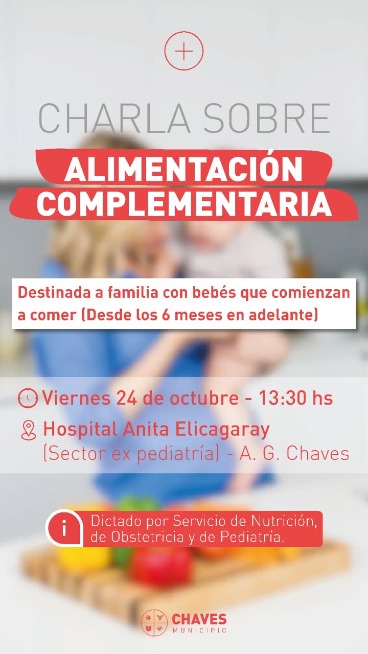12 La Secretaría de Salud de Chaves Municipio informa que la charla sobre Alimentación Complementaria, organizada por los servicios de Nutrición, Pediatría y Obstetricia, se realizará el viernes 24 de octubre a las 13:30 horas.El encuentro tendrá lugar en el Hospital Anita Eliçagaray, en el sector ex Pediatría, y está destinado a todas las familias interesadas en conocer más sobre la introducción de alimentos en la dieta de los bebés.Una propuesta abierta y gratuita, pensada para acompañar a las familias en esta etapa tan importante del crecimiento infantil.