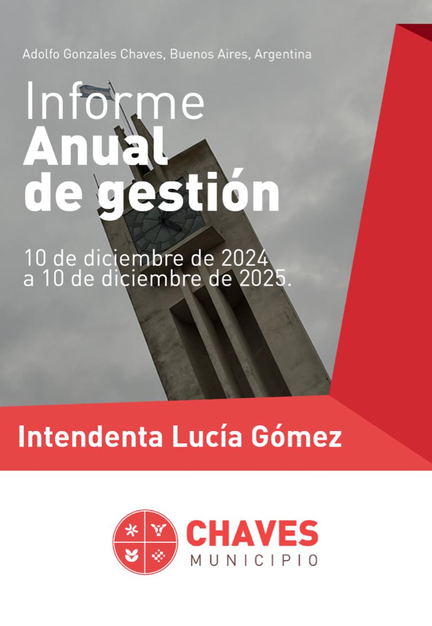 2 Chaves Municipio presentó el Informe Anual de Gestión correspondiente al segundo año de mandato de la intendenta Lucía Gómez, un documento que sintetiza el trabajo realizado durante 2025, en un contexto económico complejo, y expone los principales desafíos de cara al futuro.En la carta que acompaña el informe, la jefa comunal remarca que fue un año difícil en términos económicos, que obligó a tomar decisiones duras y a administrar con mayor cuidado los recursos disponibles. En ese escenario, destacó como prioridad absoluta la protección de lo esencial: el sostenimiento del Hospital y los Centros de Atención Primaria de la Salud (CAPS), el funcionamiento de los servicios urbanos, el acompañamiento a las familias y la presencia del Estado donde más se necesita.El informe da cuenta de un año atravesado por la necesidad de ordenar, priorizar y garantizar el funcionamiento cotidiano del Municipio, asegurando que el pueblo siga en marcha. En ese marco, la intendenta valoró especialmente el trabajo de los empleados y empleadas municipales, de las cuadrillas, del personal de salud y de cada área que, aun con limitaciones, sostuvo las prestaciones básicas del distrito.Asimismo, el documento reconoce el rol fundamental de las instituciones, los comercios, los emprendedores, los proveedores y las familias, destacando que en tiempos difíciles es la comunidad la que marca el rumbo.En su mensaje, Gómez también agradeció el acompañamiento recibido en las elecciones del 7 de septiembre, interpretándolo como un respaldo para profundizar el camino iniciado, con más orden, cercanía y resultados, y como un compromiso renovado para gobernar mejor.“El informe no es un relato, es la síntesis de un año de decisiones responsables, donde siempre pusimos por delante el cuidado de lo básico, de la gente y del futuro del distrito”, señala el texto, que reafirma la presencia de un gobierno que escucha, da la cara y está cerca de los vecinos y vecinas de Chaves, De La Garma, Barra, Vásquez y cada rincón del partido.Finalmente, el informe anual proyecta los desafíos que se vienen y convoca a la unidad y al esfuerzo colectivo para seguir construyendo el Chaves que la comunidad sueña, con un horizonte claro y una gestión presente. INFORME ANUAL 2025
