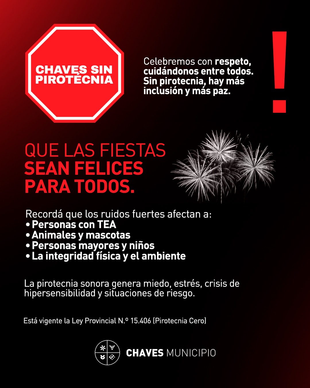 En este sentido, Chaves Municipio destaca que se encuentra vigente en la Provincia de Buenos Aires la Ley Provincial N.º 15.406, conocida como Pirotecnia Cero, que prohíbe el uso de pirotecnia sonora y promueve celebraciones más cuidadas y responsables.