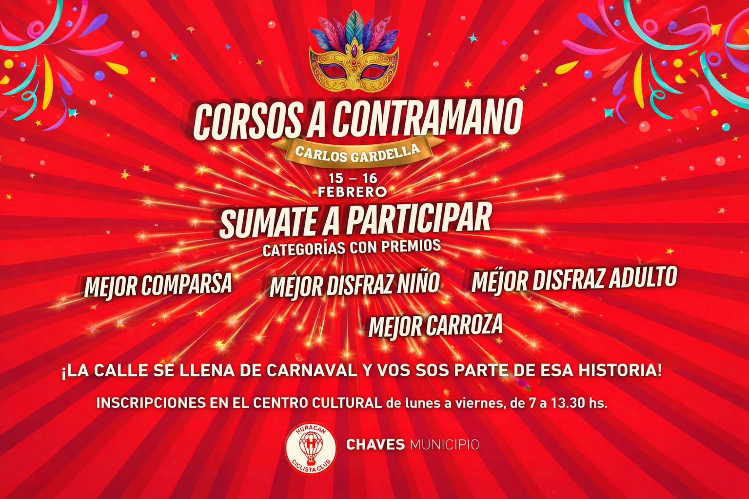 24 Chaves Municipio, junto al Club Huracán Ciclista, invita a vecinos y visitantes a disfrutar de una nueva edición de los Corsos a Contramano “Carlos Gardella”, que se desarrollarán los días 15 y 16 de febrero en Gonzáles Chaves.El evento contará con concursos y premios para distintas categorías, incluyendo la mejor comparsa, el mejor disfraz infantil y adulto, y la mejor carroza, prometiendo diversión y color para toda la familia.Las inscripciones están abiertas y se realizarán en el Centro Cultural, de lunes a viernes de 7:00 a 13:30. Es una oportunidad ideal para que comparsas, grupos y vecinos se sumen a esta celebración del carnaval, donde creatividad y alegría se combinan en un mismo espacio.No te pierdas esta fiesta popular que promete hacer vibrar a Chaves con música, baile y color. ¡Te esperamos para disfrutar del espíritu de los Corsos a Contramano!