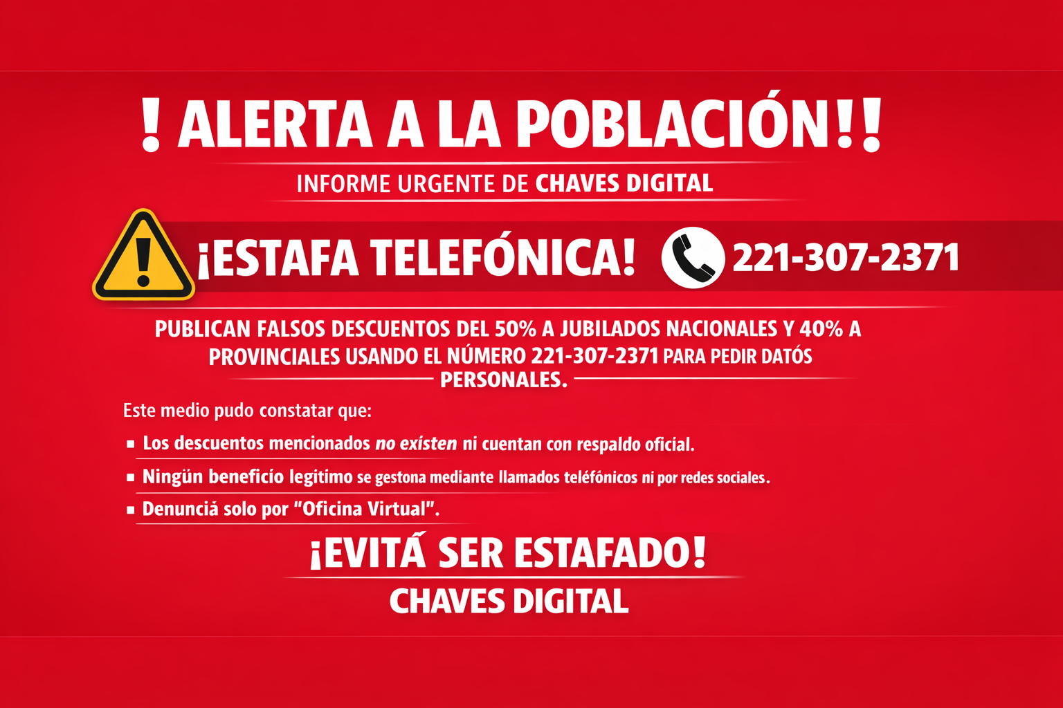 35 Chaves Digital informa a la comunidad que ha detectado la circulación de publicaciones falsas en redes sociales en las que se ofrecen supuestos descuentos del 50% para jubilados nacionales y del 40% para jubilados provinciales, utilizando el número telefónico 221-307-2371.Ante la sospecha de una posible estafa, Chaves Digital aceptó el llamado telefónico con el objetivo de corroborar la información. Durante la comunicación, se solicitó información personal, confirmando que se trata de una maniobra fraudulenta.Este medio pudo constatar que:Los descuentos mencionados no existen ni cuentan con respaldo oficial.Ningún beneficio legítimo se gestiona mediante llamados telefónicos ni por redes sociales.Los trámites y beneficios reales se realizan únicamente a través de canales oficiales.Asimismo, Chaves Digital se comunicó con Camuzzi, desde donde confirmaron que no realizan llamados ni promociones de este tipo, descartando cualquier vínculo con la maniobra detectada.Se verificó además que el perfil de Facebook desde el cual se difundían estas publicaciones fue creado el 6 de enero de 2026, lo que refuerza la sospecha de estafa.RECOMENDACIONES A LA POBLACIÓNNo brindar datos personales, bancarios o de servicios por teléfono, WhatsApp o redes sociales.Desconfiar de promociones o beneficios no informados por medios oficiales.Verificar siempre la información a través de canales oficiales.IMPORTANTECualquier denuncia vinculada a esta empresa debe realizarse exclusivamente a través de su plataforma oficial, en la sección “Oficina Virtual”.Chaves Digital solicita a la comunidad compartir esta información, especialmente con adultos mayores, para prevenir engaños y posibles perjuicios económicos.ESTE ES EL COMUNICADO EN FACEBOOKTENER CUIDADO CON ESTE TAMBIEN.