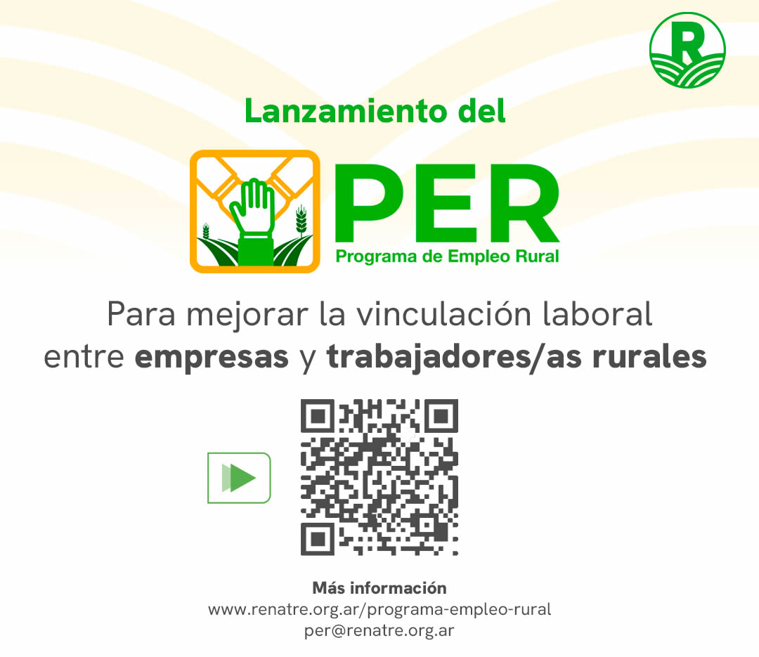 5 El Registro Nacional de Trabajadores Rurales y Empleadores (RENATRE) presentó el Programa de Empleo Rural (PER), una iniciativa desarrollada durante 2025 y aprobada por el Cuerpo Directivo del organismo mediante la Resolución N.º 20/2026, orientada a promover el empleo formal, fortalecer las competencias laborales de trabajadores y trabajadoras rurales, y mejorar la productividad y competitividad de las unidades agropecuarias y forestales en todo el país.El servicio es gratuito y está destinado a empleadores rurales registrados en el organismo que necesiten cubrir puestos laborales y potenciar las capacidades de sus equipos de trabajo. En una primera etapa, el programa estará dirigido a trabajadores y trabajadoras rurales beneficiarios del Sistema Integral de Prestaciones por Desempleo (SIPRED).Para acceder al PER, las empresas deberán ingresar al Portal RENATRE e iniciar sesión con su cuenta registrada para gestionar el trámite correspondiente. Por su parte, las personas trabajadoras solo deberán completar sus datos a través del formulario web habilitado.El principal objetivo del programa es conformar, a largo plazo, una red digital de perfiles laborales disponibles, generando un registro actualizado de trabajadores y trabajadoras rurales candidatos a empleo. Asimismo, el RENATRE brindará asistencia técnica y personalizada a las empresas, acompañando los procesos de búsqueda, selección y contratación de personal.En el caso de quienes perciben la prestación por desempleo, el PER contempla orientación y acompañamiento en la búsqueda laboral, capacitaciones en habilidades técnicas y socio-laborales con certificación de competencias, y asesoramiento sobre el cumplimiento de la normativa laboral vigente.“El desarrollo de este servicio busca posicionar al RENATRE como un puente efectivo entre empleadores y trabajadores rurales. Brindamos a los empleadores la seguridad de contar con personal calificado y confiable, y a los trabajadores un espacio de acompañamiento para facilitar su inserción laboral. Esta iniciativa impactará directamente en más de 56 mil productores y 325 mil trabajadores en todo el país”, afirmó el presidente del Registro, Abel Guerrieri.Por su parte, el director del RENATRE, José Voytenco, destacó que el programa —cuya planificación estratégica comenzó en 2025 durante su presidencia en el organismo— “fortalece el trabajo rural al garantizar que cada trabajador y trabajadora cuente con el acompañamiento del Registro en su búsqueda de empleo. A través del PER, buscamos que el trabajo en el campo sea sinónimo de crecimiento y de un futuro más seguro para las familias rurales”.Con esta propuesta, el RENATRE continúa impulsando el desarrollo territorial, promoviendo el arraigo rural y contribuyendo al crecimiento productivo del sector agropecuario.Para conocer más sobre las acciones, programas y servicios del RENATRE, ingresá a www.renatre.org.ar y seguí las redes sociales oficiales @renatreinforma.