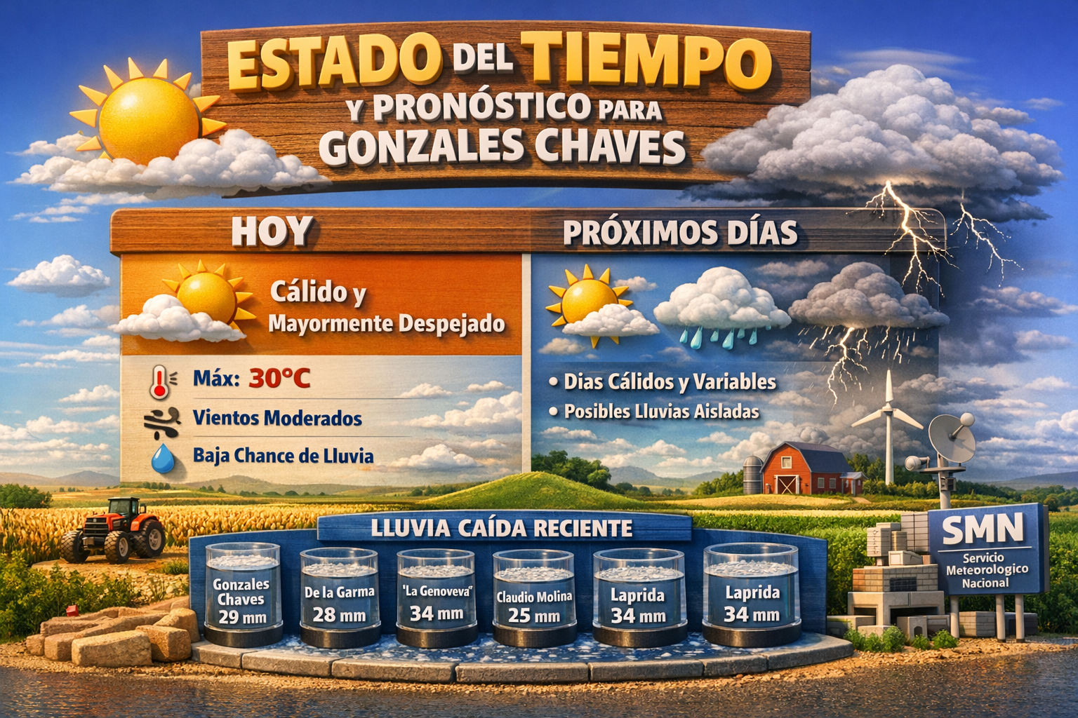 4 En la jornada de hoy, el clima en Gonzales Chaves se presenta cálido y con predominio de cielo mayormente despejado o con nubosidad variable, con temperaturas máximas cercanas a los 30 °C y moderada intensidad de viento durante la tarde. La probabilidad de precipitaciones se mantiene baja en estas horas.Para los próximos días, la tendencia del tiempo indica condiciones mayormente estables y cálidas, con temperaturas máximas que se ubicarían usualmente entre los 28 °C y más, según el día. Algunos modelos de pronóstico señalan la posibilidad de intervalos de nubosidad y chance de lluvias aisladas o tormentas en determinadas jornadas, sobre todo por la tarde o la noche, aunque predominan los días con buen tiempo.Resumen de condiciones meteorológicas previstas:Hoy: tiempo cálido, cielo mayormente despejado o con algunas nubes, bajas chances de lluvia y vientos moderados.Próximos días: predominio de días cálidos y estables, aunque no se descartan episodios de nubosidad variable y probables lluvias aisladas en ciertos sectores dependiendo de la evolución del sistema meteorológico.Desde organismos meteorológicos se recomienda consultar las actualizaciones oficiales del Servicio Meteorológico Nacional (SMN), ya que la situación atmosférica puede cambiar y es fundamental para la planificación de actividades al aire libre o de cosecha, así como para anticiparse a posibles lluvias o tormentas localizadas.Lluvia caída durante la noche de ayer y la madrugada de hoy: Gonzales Chaves 29 mm De la Garma 28 mm Establecimiento “La Genoveva” 34mm De la Garma Claudio Molina 25 mm Laprida 34 mm Vásquez 23 mm