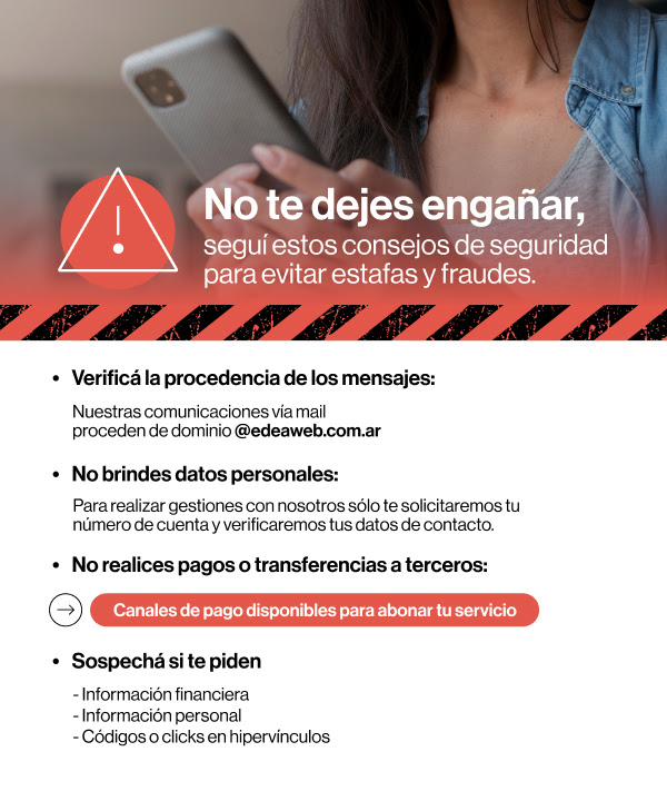 0 ESTAFAS EN NOMBRE DE EDEA: LA EMPRESA BRINDA RECOMENDACIONES PARA IDENTIFICAR EL FRAUDE Y NO CAER EN LA TRAMPASe producen a través de WhatsApp, redes sociales, correos electrónicos y llamadas telefónicas. Desde la empresa solicitan a los usuarios no compartir datos personales y consultar los canales oficiales.Ante los intentos de estafas mediante llamados telefónicos, mensajes de WhatsApp o correos electrónicos de personas que se hacen pasar por gestores comerciales de la empresa, EDEA recuerda a sus usuarios que:No realiza llamados telefónicos solicitando números de contacto personal.No ofrece reprogramaciones de cortes programados a cambio de pagos.No ofrece descuentos promocionales de tarifa eléctrica a jubilados y pensionados.No comparte códigos vía WhatsApp u otro servicio de mensajería. ● No solicita pagos a nombre de terceros.El WhatsApp oficial de la empresa (+54 9 223 6 34 3332) es el único habilitado para realizar gestiones y operaciones, y puede corroborarse por el tilde verde junto a EDEA. Por otro lado, la distribuidora únicamente solicita el Número de Identificación de Suministro (NIS) a través de los canales habilitados. Por eso, para evitar ser víctimas de estafa, es importante no compartir datos confidenciales tales como:Claves personalesNúmeros de tarjetasCódigos recibidos en su celularLa empresa bajo ningún término ofrece descuentos promocionales sobre períodos ya facturados. Únicamente en oficinas comerciales o a través de canales oficiales los usuarios podrán acceder a planes de pago, gestionar subsidios, entre otros.EDEA solo se comunica con el usuario cuando éste solicita un turno telefónico programado a través de la Oficina Virtual y la aplicación móvil de la compañía. Asimismo, es importante destacar que por normativa los operarios no tienen autorización para ingresar a los domicilios particulares.Campañas preventivas contra fraude Con el fin de proteger a sus usuarios y brindar información clara sobre posibles intentos de estafa, EDEA lanzó una nueva campaña preventiva de concientización a través de distintos canales bajo el lema: Juntos nos cuidamos de las estafas.Estas campañas incluyen publicaciones en redes sociales, envíos de correos electrónicos informativos y comunicados en medios de comunicación, alertando sobre las diferentes modalidades de fraude y brindando consejos para reconocerlas.Los canales oficiales de EDEA son:Whatsapp +54 9 223 6 34 3332App EDEA MóvilCall Center 0800 666 3332 / 0810 999 3332Oficina Virtual https://oficinavirtual.edeaweb.com.ar/ingresoWeb EDEA – Empresa Distribuidora de Energía Atlántica S.A (edeaweb.com.ar)Redes sociales Facebook https://www.facebook.com/edea.comunica556266Instagram EDEA (@prensaedea)X (ex Twitter) EDEA S.A. (@prensaedea)LinkedIn EDEA: Empresa Distribuidora de Energía Atlántica S.A.
