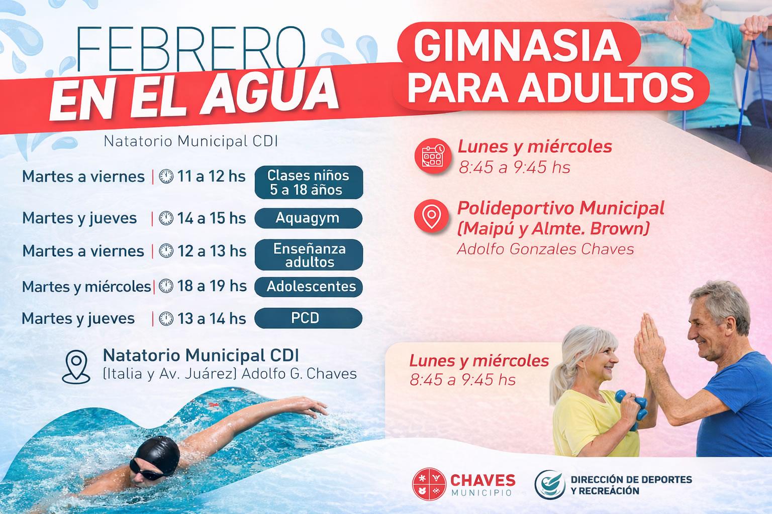 9 La Dirección de Deportes y Recreación de Chaves Municipio informa a la comunidad sobre las actividades que se llevarán a cabo a partir de febrero, promoviendo la salud, el movimiento y la participación de vecinos de todas las edades.Natatorio Municipal ( calle Italia y Avenida Juárez)Clases de natación (5 a 18 años): martes a viernes de 11:00 a 12:00.Aquagym: martes y jueves de 14:00 a 15:00.Enseñanza para adultos: martes a viernes de 12:00 a 13:00.Clases para adolescentes: martes y miércoles de 18:00 a 19:00.Natación para PCD (Personas con Discapacidad): martes y jueves de 13:00 a 14:00.INSCRIPCIONES EN NATATORIOPolideportivo Municipal:Gimnasia para adultos: lunes y. miércoles de 8:45 a 9:45.Las inscripciones se realizan de manera presencial en el Polideportivo Municipal, ubicado en calle Maipú y Almirante Brown.Desde la Dirección de Deportes y Recreación invitan a toda la comunidad a sumarse a estas actividades, fomentando el bienestar físico y la vida activa en el distrito.