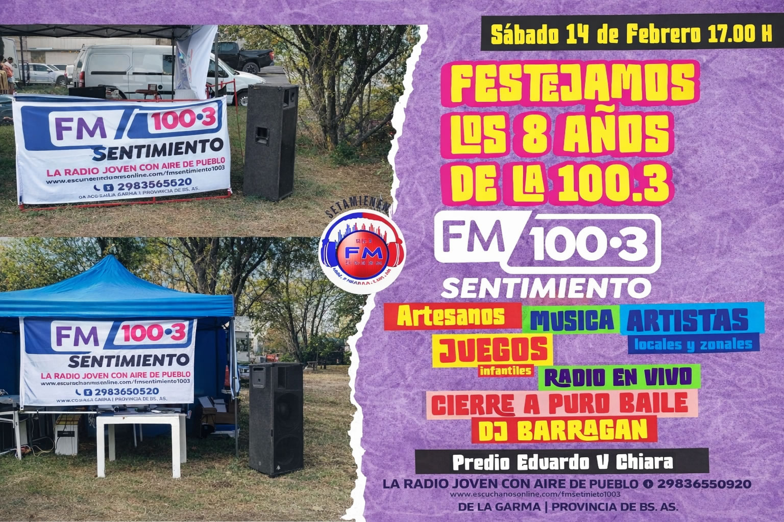 16 La radio es mucho más que un medio de comunicación. Es compañía cotidiana, es información cercana, es identidad y pertenencia. En cada localidad, la radio cumple un rol social fundamental: acompaña, escucha y da voz a quienes muchas veces no la tienen.Las radios comunitarias existen y se sostienen gracias al compromiso de su gente y al apoyo permanente de los comerciantes locales, que con esfuerzo hacen posible que la radio siga sonando. Apoyar a la radio es fortalecer el entramado social, cultural y comunicacional de toda la comunidad.En este marco, FM Sentimiento 100.3 de La Garma celebra con orgullo sus 8 años en el aire e invita a toda la población local y de la zona a ser parte de los festejos.El encuentro se realizará el sábado 14 de febrero, a partir de las 17 horas, en el predio Eduardo V. Chiara, con una jornada pensada para compartir en familia y con amigos.Durante la celebración habrá un programa de radio en vivo, feria de artesanos locales y de la región, la participación del tradicional Pochoclero Carlitos, food trucks durante toda la tarde, juegos deportivos, y la presentación de artistas locales y zonales. El cierre de la jornada estará a cargo de Barragán DJ, con sonido e iluminación.FM Sentimiento 100.3 renueva así su compromiso con la comunidad, celebrando estos ocho años junto a quienes la acompañan día a día, convencidos de que la radio sigue viva gracias al apoyo colectivo y al trabajo compartido.La invitación está abierta a toda la comunidad para celebrar juntos la radio de La Garma.