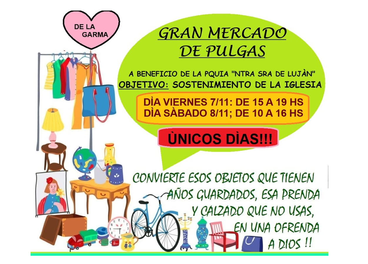 7 La Parroquia Nuestra Señora de Luján de De la Garma organiza una nueva edición del Gran Mercado de Pulgas, una iniciativa solidaria destinada a recaudar fondos para el sostenimiento de la iglesia. La actividad se desarrollará en el Salón Parroquial los días viernes 7 y sábado 8 de noviembre, en jornadas únicas.Fechas y horarios:Viernes 7 de noviembre: de 15 a 19 horasSábado 8 de noviembre: de 10 a 16 horasEl evento busca promover la ayuda mutua y el compromiso comunitario. En el mercado se pondrán a la venta artículos de bazar, antigüedades, adornos, muebles, electrodomésticos, calzado y ropa para todas las edades, entre otros objetos de interés.Asimismo, la organización invita a los vecinos a colaborar con donaciones de artículos en buen estado, recordando que cada aporte constituye una ofrenda a Dios.Recepción de donaciones:Viernes 30 de octubre: de 17 a 19 horasLunes 3 y martes 4 de noviembre: de 17 a 19 horasLas entregas se recibirán en el Salón Parroquial.Para quienes deseen colaborar de manera económica, la parroquia cuenta con una Cuenta DNI habilitada.Desde la comunidad parroquial agradecen el acompañamiento y solicitan la difusión de la actividad entre los vecinos.