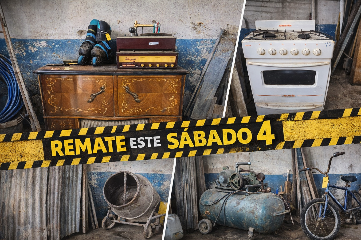 0 Este sábado 4, desde las 15 hs, gran remate sin base en Lavalle 230 (frente al Registro Civil). Maquinarias, herramientas, materiales de construcción, muebles y más se venden al mejor postor y hasta terminar. Exhibición desde las 10 hs. ¡Todo debe salir!Daniel VillamañeEste sábado 4Desde las 15:00 hs (puntual)Calle Lavalle 230 – frente al Registro CivilExhibición: sábado desde las 10:00 hsSIN BASE Y HASTA TERMINAR – TODO SALEGran remate de artículos varios, ideal para constructores, recicladores, revendedores y público en general:Maquinaria y equipos:Hormigonera (mezcladora de cemento)Compresor de aireEstructuras metálicas y soportesHerramientas y trabajo:Palas y herramientas de obraCarro de transporteElementos varios de tallerMateriales de instalación:Rollos de caños/mangueras (azules y negras)Mallas y tejido metálicoAislantes (lana de vidrio en rollos)Maderas y construcción:Tablones, vigas y placasPaneles de madera y superficies variasMateriales reciclables para obraAberturas y estructuras:Ventanas, marcos y postigosVidrios y panelesMuebles y hogar:Mesas y estructurasColchones y sommiersCocina portátilMuebles y partes variasOtros materiales:Cañas/bambúLotes de objetos variosTodo se vende en el estado en que se encuentra y donde está.Ideal para aprovechar precios de oportunidad.Vení temprano a revisar, elegí y llevate lo que necesites.REMATE SIN BASE – TODO DEBE SALIR