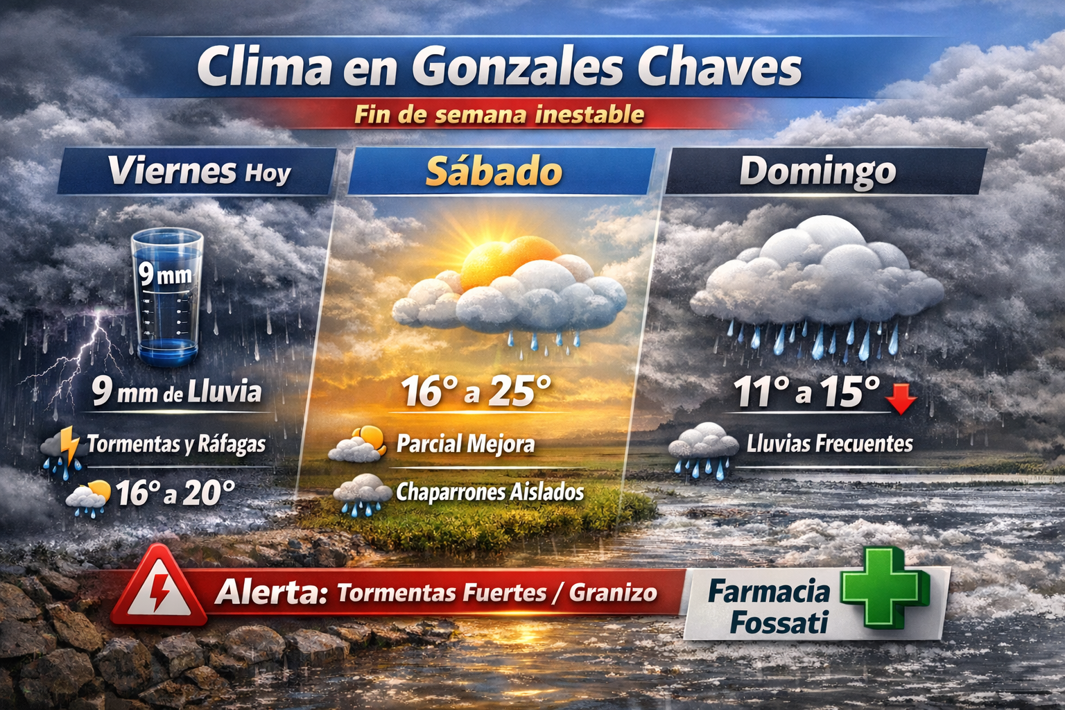 Inestabilidad y lluvias marcarán el clima en Gonzales Chaves durante el fin de semana