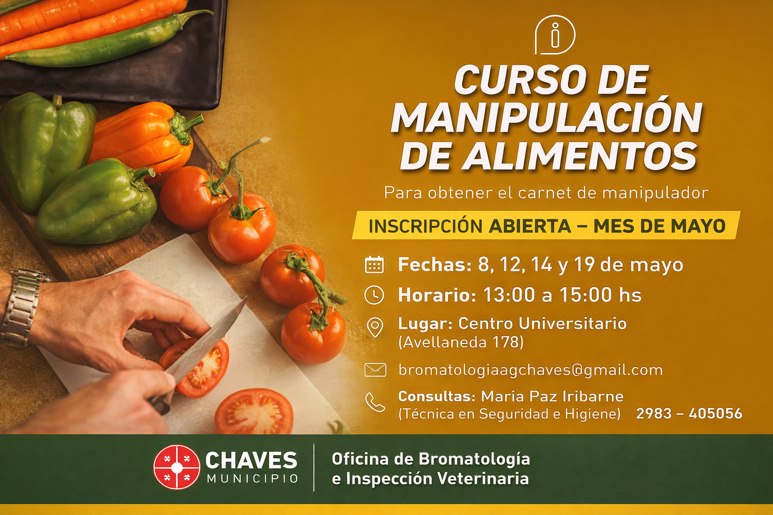 0 La Oficina de Bromatología de Chaves Municipio informa que se encuentra abierta la inscripción para un nuevo Curso de Manipulación de Alimentos, requisito obligatorio para la obtención del carnet de manipulador.La capacitación se desarrollará durante el mes de mayo, los días 8, 12, 14 y 19, en el horario de 13 a 15 horas. El curso podrá realizarse tanto de manera presencial como virtual y asincrónica, y está destinado a todas aquellas personas que trabajen o deseen desempeñarse en actividades vinculadas a la elaboración, transporte, almacenamiento o comercialización de alimentos.El curso tiene como objetivo brindar herramientas y conocimientos fundamentales sobre higiene, seguridad alimentaria y buenas prácticas de manipulación, contribuyendo a la prevención de enfermedades transmitidas por alimentos y al cuidado de la salud de la comunidad.Para más información o para realizar la inscripción, las personas interesadas pueden escribir al correo electrónico [email protected] o comunicarse telefónicamente al 2983-405056. La inscripción se realiza a través de estos mismos canales.La propuesta es organizada por la Oficina de Bromatología e Inspección Veterinaria de Chaves Municipio y se desarrollará en Adolfo Gonzales Chaves.