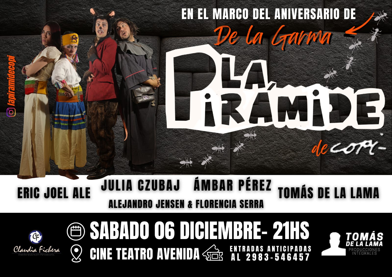 27 En la previa del aniversario de De la Garma se estrena en el Cine Teatro Avenida La Pirámide, la obra dirigida por Tomás De la Lama que propone una mezcla explosiva de humor, absurdo y ritualidad.La función será a las 21 hs en el Cine Teatro Avenida y las entradas se encuentran a la venta desde esta semana. Pueden adquirirse por Instagram en @lapiramidecopi o comunicándose al 2983-546457.Esta propuesta que nace en la localidad de Tres Arroyos ya tiene definidas funciones en Coronel Pringles, Tres Arroyos y Claromecó, siendo el estreno un motivo excelente para acercarse a vivir el teatro regional. Con el apoyo de la Dirección de Cultura y Turismo del municipio de Adolfo Gonzales Chaves, la obra se enmarca en los festejos por el 113 aniversario de la localidad que se desarrollarán los días 7 y 8 de diciembre.Luego de la presentación, se realizará una noche de encuentro con acceso libre y gratuito en el espacio ECNE de la Biblioteca Popular Víctor H. Barrera. La actividad comenzará aproximadamente a las 22:30, luego de terminada la presentación, e incluirá un desmontaje de la obra, donde actores, actrices y parte del equipo técnico dialogarán con el público y compartirán el proceso de creación.Además, la comisión ofrecerá buffet para celebrar y habrá música en vivo.¡Una fiesta teatral para celebrar juntos el aniversario del pueblo!