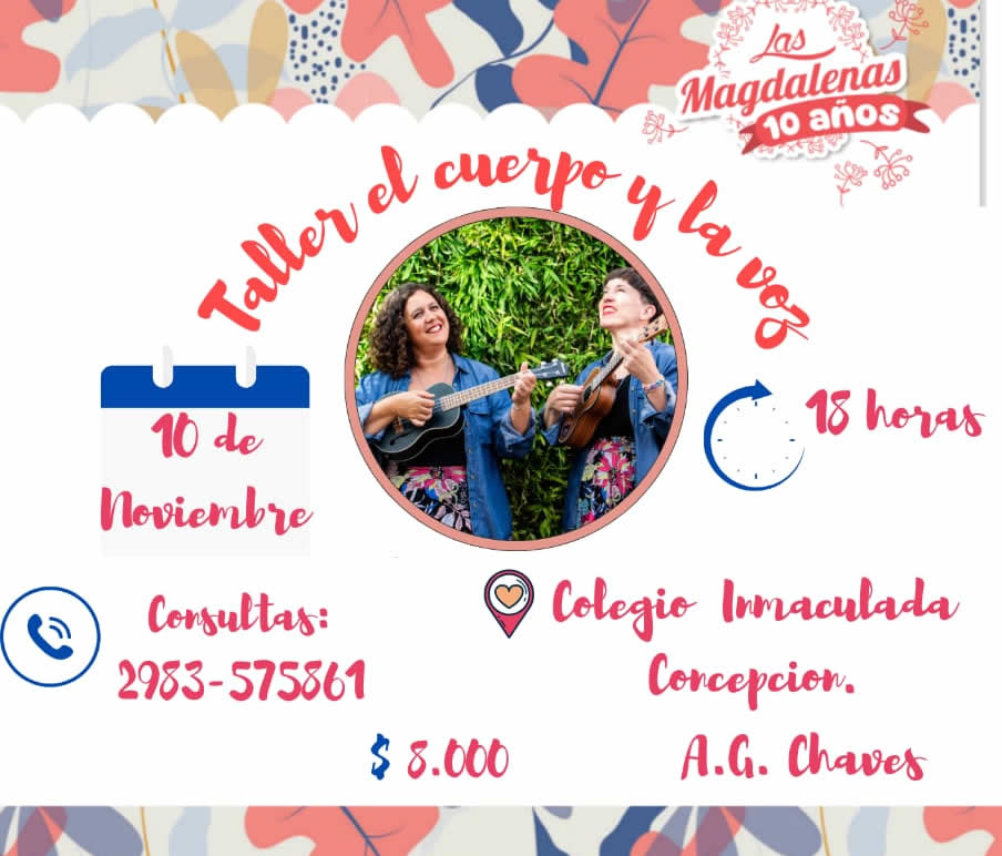 24 Las Magdalenas son un dúo argentino que convirtió la música en un abrazo colectivo para nuestras infancias. Julieta Dorronsoro y Mery Vanborder se encontraron en la vida y en la música, y desde 2015 crean un universo donde las emociones juegan, los cuerpos exploran y la poesía se vuelve melodía. Guitarra, ukelele y dos voces que arrullan el alma dan forma a su propuesta sensible y luminosa.Su proyecto artístico nació como un guiño travieso: “Canciones para crecer jugando”, que pronto se transformó en su primer disco y en un pasaporte a escenarios de todo el país. El Camarín de las Musas, el CCK, la Usina del Arte, Tecnópolis, el Parador Recreo, festivales nacionales e internacionales y giras por Chile y Uruguay ya fueron testigos de su espectáculo, donde la música se entrelaza con el juego, el humor, el movimiento y la poesía.Cuentan con dos discos: Canciones para crecer jugando y Canciones chiquitas, este último con la participación de la inmensa Marta Gómez y el apoyo del INAMU para su producción audiovisual. Además, su tema “Canción para bañar la luna” superó los 12 millones de vistas en YouTube, acompañando baños, noches y sueños de miles de familias en toda la galaxia.Pero Las Magdalenas no solo cantan: piensan, sienten y activan. Hablan de derechos, diversidad, emociones, juego, respeto y crianza amorosa. Su libro Canción de las emociones, publicado por Editorial Pupek, es hoy un tesoro en escuelas y hogares, y algunas de sus canciones forman parte del material educativo nacional.Música que hace cosquillas, que invita a moverse, respirar y sentir. Música que entiende que crecer es una aventura, y que la ternura, cuando se comparte, tiene superpoderes.Hoy siguen girando, componiendo, grabando y soñando. Suman invitados, se transforman en trío o banda, y van sembrando canciones allí donde haya una infancia con ganas de cantar.Taller “El cuerpo y la voz” – Las Magdalenas 10 años10 de noviembre – 18 horasUna experiencia para reencontrarte con tu voz, tu ritmo interno y la potencia de tu cuerpo como instrumento expresivo.Las Magdalenas, con diez años recorriendo escenarios de todo el país y Latinoamérica, invitan a compartir este espacio de exploración y juego.Dirigido a: educadores, artistas y toda persona que desee activar su voz y su energía vital de manera consciente, amorosa y divertida.Consultas: – Tel. 2983-575861Valor: $8.000Lugar: Colegio Inmaculada Concepción – Adolfo Gonzales Chaves