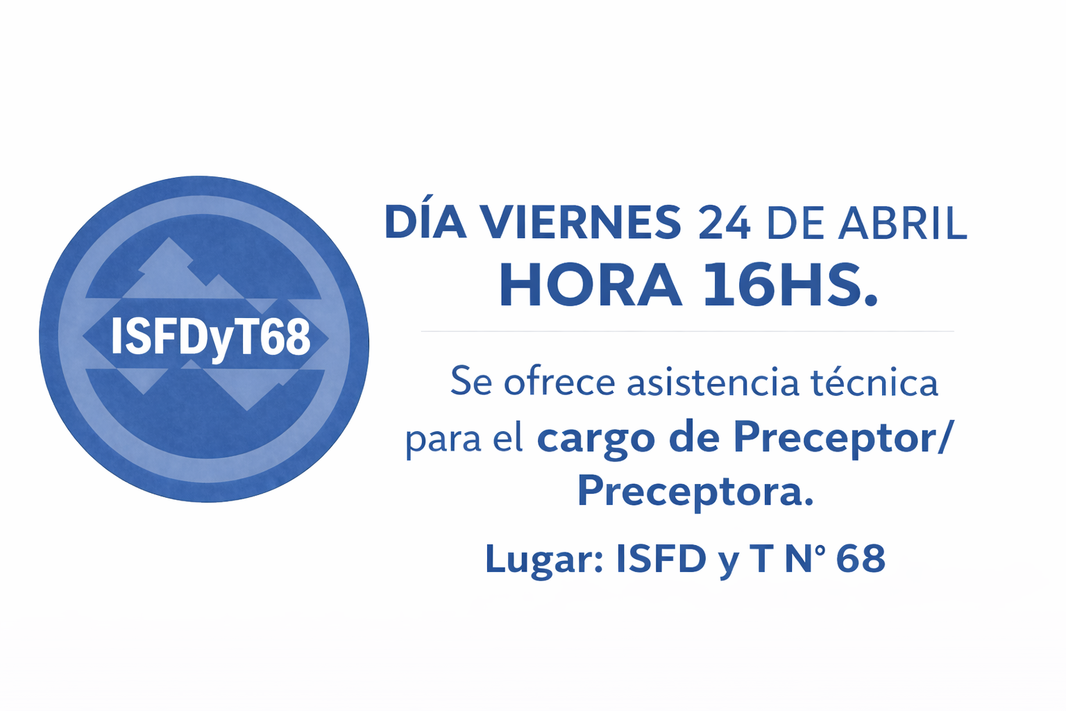 El Instituto Superior de Formación Docente y Técnica Nº 68 y la Secretaría de Asuntos Docentes comunican llamado a prueba de selección por evaluación de títulos, antecedentes y oposición para la cobertura de cargo preceptor/a según lo establecido en la Resolución Nº 6159/25. La inscripción de los aspirantes se llevará a cabo en el siguiente domicilio electrónico , isfdyt68pruebasdeselecció[email protected] que se constituye en la sede de la prueba para las inscripciones y las notificaciones.  Para inscribirse es necesario presentar Formulario 1  – Formulario 2 Anexo  9 y un único archivo pdf con toda la documentación incluyendo documento, título y probanzas correspondientes) sin excepciones.  No se considerarán presentaciones que no cumplan estos requisitos.