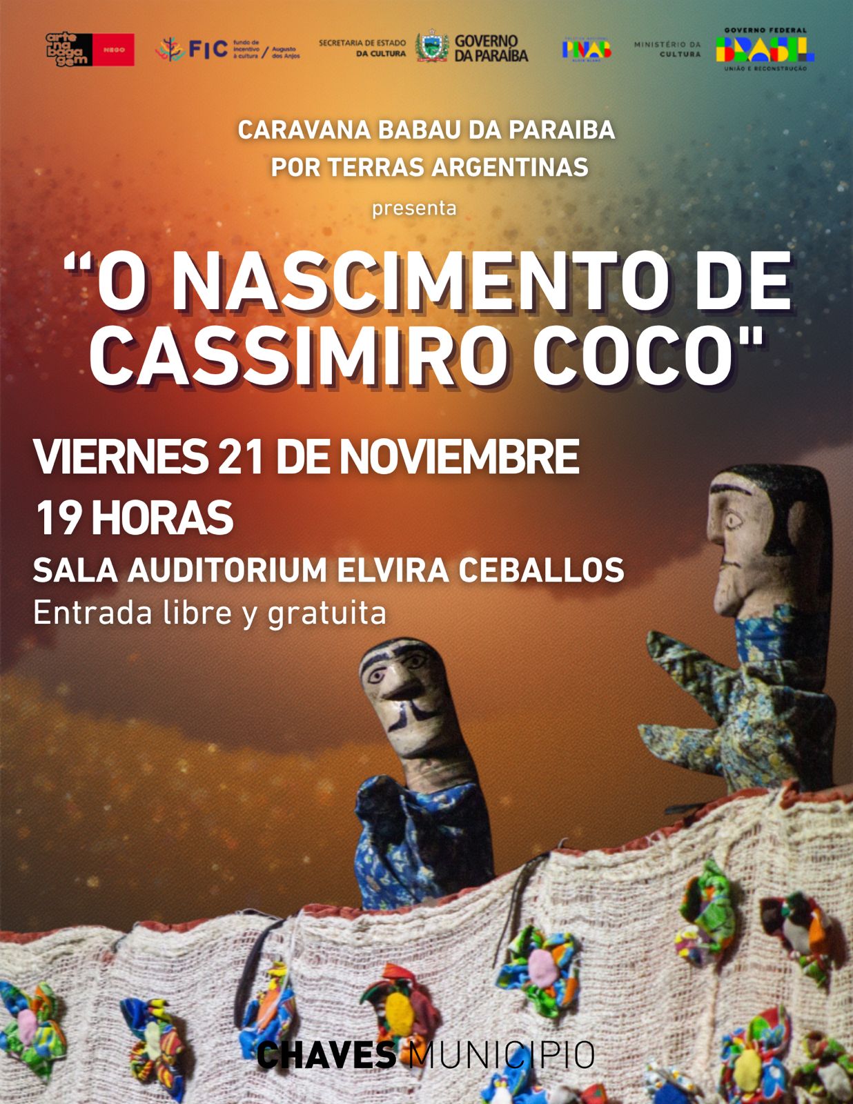 8 La Caravana Babau da Paraíba visita tierras argentinas para presentar “O Nascimento de Cassimiro Coco”, una obra llena de color, humor y tradición del teatro popular brasileño.¿De qué se trata?Buenas noticias en Sitio Estrela do Norte: Benedito está por convertirse en padre y quiere celebrarlo con una gran fiesta. Pero la truculencia del temido Coroné João Redondo amenaza con arruinar el gran día.¿Logrará Benedito evitar el desastre?Una aventura llena de diversión, música y personajes entrañables.Viernes 21 de noviembre19 horasSala Auditorium Elvira CeballosEntrada libre y gratuitaUn espectáculo para disfrutar en familia, con todo el encanto de la cultura popular paraibana.Producido con recursos de la Política Nacional Aldir Blanc. Implementación: Secretaría de Estado da Cultura da Paraíba – Gobierno del Estado de Paraíba, a través de la Convocatoria Arte na Bagagem.