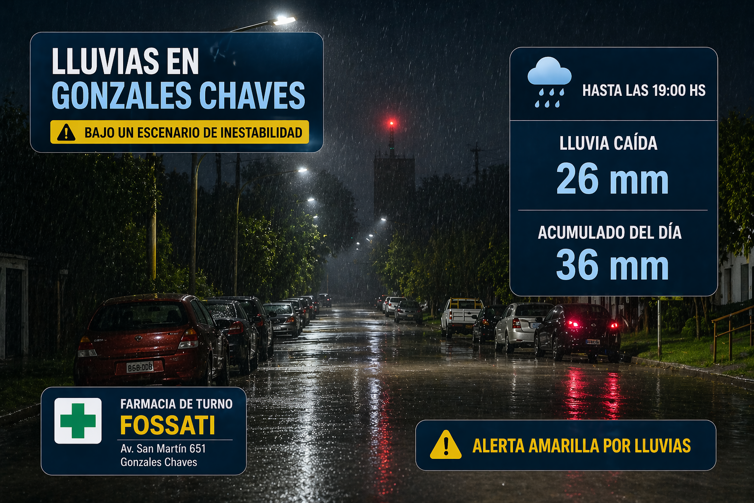 7 El sudeste de la provincia de Buenos Aires atraviesa este martes una jornada inestable, con lluvias en desarrollo en Gonzales Chaves y la región.Hasta las 19:00 horas, se registraron 26 mm de lluvia caÃda, mientras que el acumulado total del dÃa alcanza los 36 mm, en el marco de un sistema de inestabilidad que afecta a gran parte de la zona.Las precipitaciones se presentan de manera intermitente, con perÃodos de mayor intensidad, bajo un cielo mayormente cubierto y con ambiente húmedo.De acuerdo a los parámetros habituales del Servicio Meteorológico Nacional, el área se encuentra bajo condiciones compatibles con alerta amarilla por lluvias, lo que implica la posibilidad de acumulados significativos en cortos perÃodos.Se recomienda circular con precaución, especialmente en caminos rurales, donde la transitabilidad puede verse afectada, y mantenerse informados a través de los canales oficiales ante posibles actualizaciones.Farmacia de turno: Fosatti.El pronóstico indica que las condiciones podrÃan mejorar de manera gradual hacia las próximas horas o durante la jornada del miércoles.