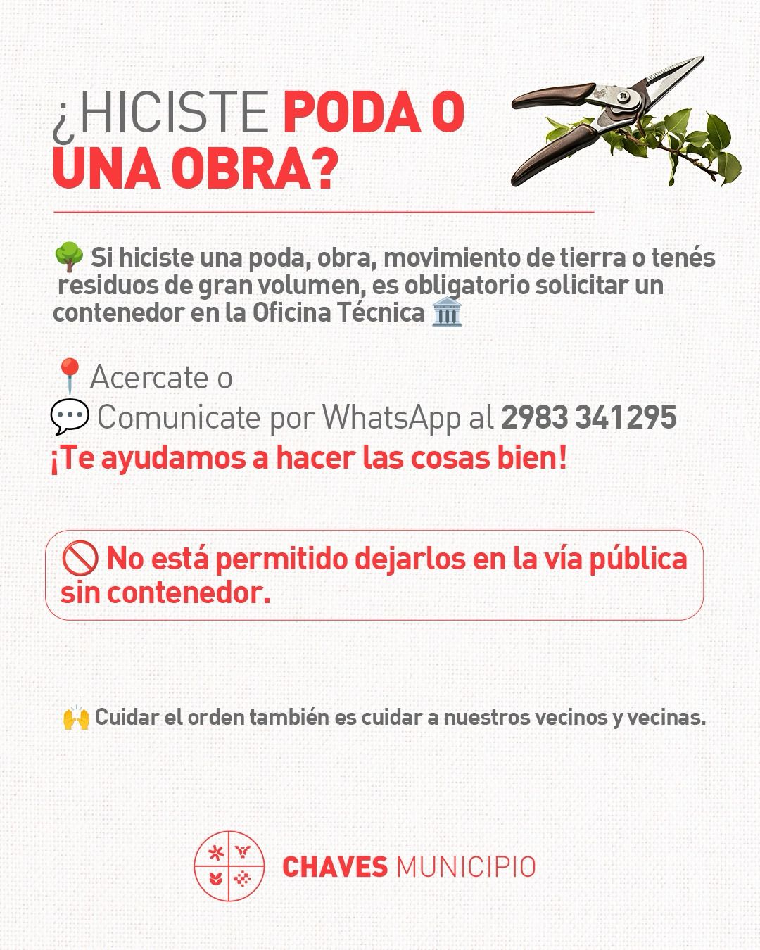 7 En el marco del refuerzo de la campaña de cuidado, orden y limpieza de la ciudad, la Secretaría de Obras y Servicios Públicos de Chaves Municipio informa a vecinos y vecinas las recomendaciones para disponer correctamente residuos en la vía pública, especialmente maleza, escombros y restos de poda.Desde el área se advierte que, cuando estos materiales se dejan sueltos en la vereda o sobre la calzada, la lluvia, el viento o incluso animales pueden desparramarlos y hacer que terminen obstruyendo los desagües pluviales. Esta situación dificulta el normal escurrimiento del agua, genera anegamientos y afecta tanto la circulación como la seguridad de toda la comunidad.Para evitar estos inconvenientes y contribuir a una ciudad más ordenada y funcional, se recuerda la importancia de cumplir con las siguientes pautas:•Residuos de menor volumen: colocarlos en bolsas o recipientes resistentes, correctamente cerrados.•Podas, escombros u obras de mayor volumen: solicitar contenedores municipales para una disposición adecuada.Cuidar la limpieza y el orden del espacio público es una responsabilidad compartida: mejora cada barrio, previene problemas mayores y pone en valor los espacios comunes.Para consultas o para solicitar contenedores, las personas interesadas pueden comunicarse por WhatsApp al 2983 341295.Desde Chaves Municipio se destaca que, con el compromiso de todos y todas, es posible sostener una ciudad más ordenada, segura y cuidada.