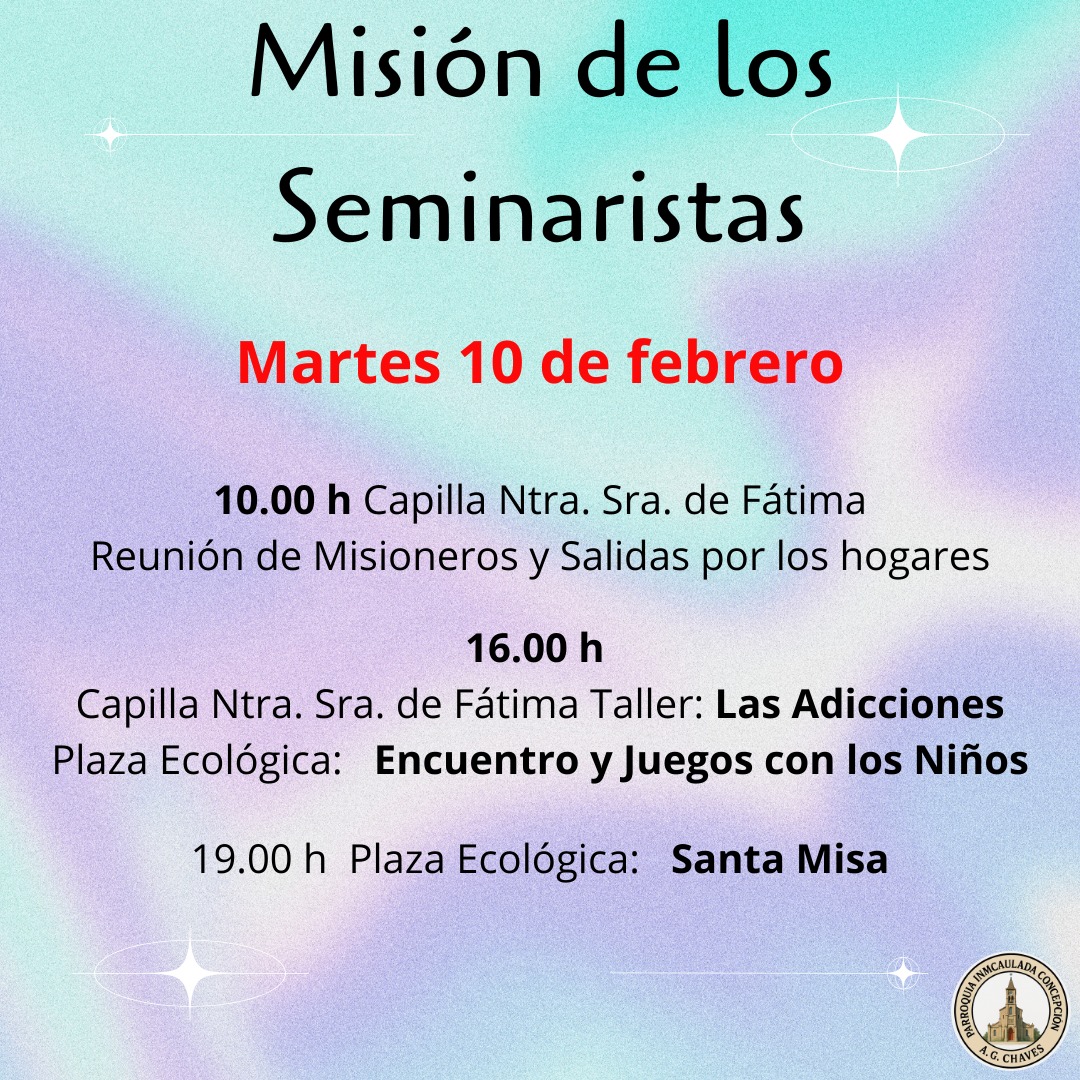 5 En el marco de la Misión de los Seminaristas 2026, que se desarrolla en Adolfo Gonzales Chaves, continúan las actividades abiertas a toda la comunidad en Plaza Ecológica y Capilla Nuestra Señora de FátimaLa propuesta misionera incluye visitas a hogares por la mañana, celebraciones, actividades recreativas para niños, talleres y liturgia, con el objetivo de fortalecer el encuentro, la fe y el acompañamiento pastoral.Agenda para la jornada hoy, martes 10 de febrero10:00 a 12:00 hs: Visita de casas.16: 00 hs: Taller “Adicciones y Tecnologías” (Parte 1) en Capilla de Fátima. Juegos para niños en Plaza Ecológica.19:00 hs: Misa en Plaza Ecológica.La invitación es abierta a toda la comunidad a sumarse y participar de las actividades previstas para el día.La Misión de los Seminaristas se extenderá hasta el sábado 21 de febrero con Misa cierre, en la Capilla Nuestra Señora de Fátima, a las 19 horas.