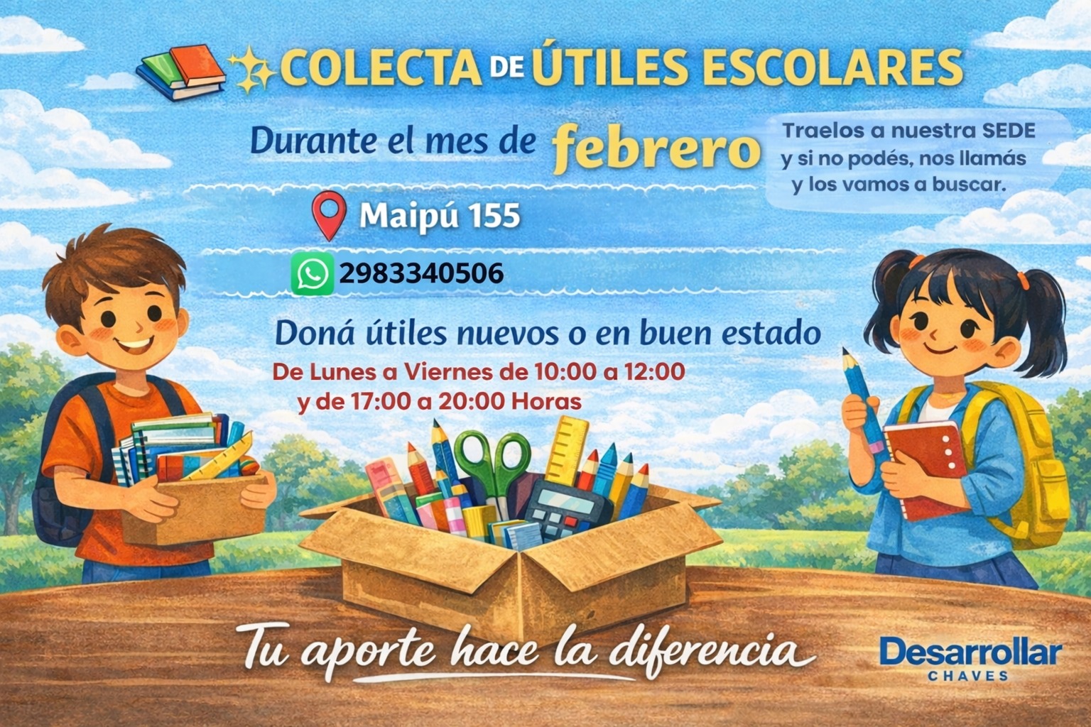 8 Durante todo el mes de febrero, la ONG Desarrollar organiza una campaña de donación de útiles escolares en toda la comunidad, según confirmó el presidente de la entidad, José Garibotti.La iniciativa busca recolectar aquellos útiles escolares de todo tipo que ya no se usan, sean usados o nuevos, y que puedan ser utilizados por los chicos que lo necesiten en las escuelas y jardines.Garibotti dijo que la idea es que los vecinos acerquen los útiles a la sede de Desarrollar –Maipú 155- que actuará como receptora, y en caso que no puedan hacerlo deben comunicarse al 2983-340506 y voluntarios pasarán a retirar los materiales por los domicilios.*Los horarios de recepción son: de lunes a viernes de 10 a 12:00 y de 17 a 20 horas.*Con esta iniciativa, Desarrollar busca acompañar a las familias y ayudar a que los chicos inicien el ciclo lectivo con los materiales necesarios al momento de preparar la mochila.“A veces guardamos en la casa materiales escolares demasiado tiempo y no sabemos bien porqué… y no nos damos cuenta que pueden ser utilizados por otras personas: tal vez en manos de otros chicos pueden ser una oportunidad para aprender mejor”, comentó.