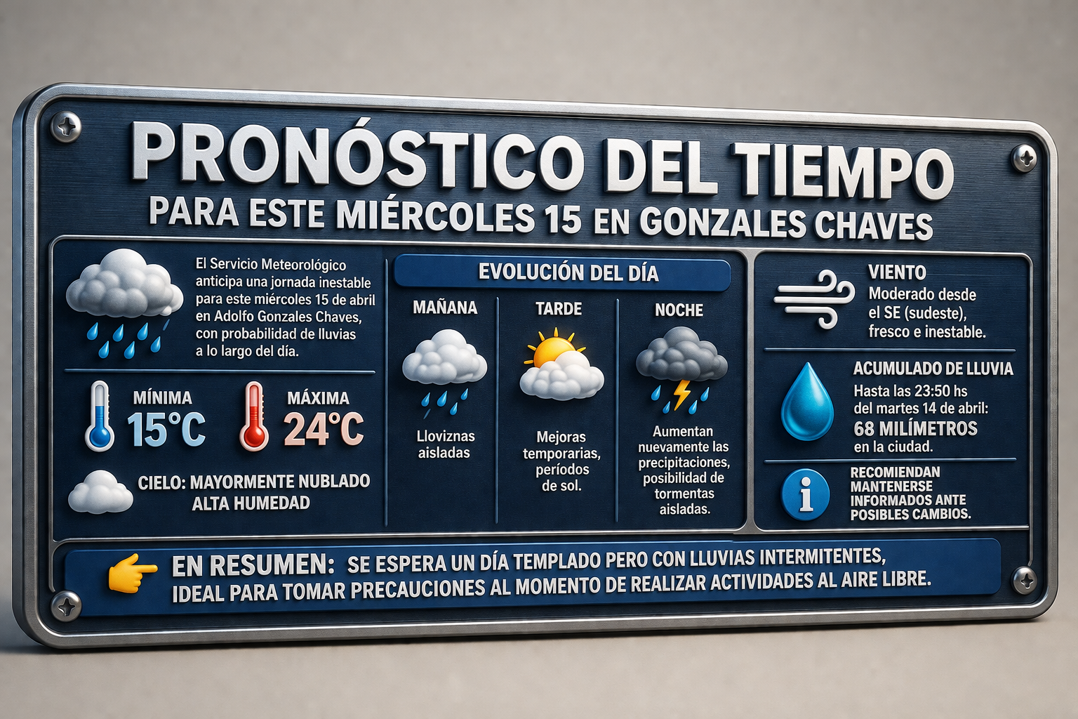 El Servicio Meteorológico anticipa una jornada inestable para este miércoles 15 de abril en Adolfo Gonzales Chaves, con probabilidad de lluvias a lo largo del día.