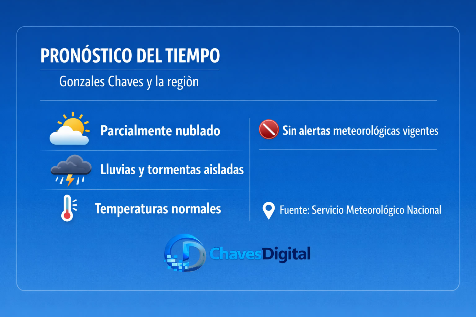 0 El Servicio Meteorológico Nacional informó que, para Adolfo Gonzales Chaves y localidades de la región, se espera una situación meteorológica variable durante los próximos días.De acuerdo con el organismo oficial, el período estará caracterizado por cielos parcialmente nublados, con probabilidad de lluvias y tormentas aisladas en algunas jornadas, intercaladas con mejoras temporarias. Las temperaturas se mantendrán dentro de los valores normales para la época.En cuanto a las alertas, al momento de la consulta no se registran avisos meteorológicos oficiales vigentes para el distrito de Gonzales Chaves. No obstante, desde el Servicio Meteorológico Nacional recomiendan mantenerse informados, ya que las condiciones pueden modificarse y dar lugar a la emisión de alertas preventivas.La información oficial y las actualizaciones del pronóstico pueden consultarse a través de los canales habituales del SMN.Lluvia caidaGonzales Chaves 4 mmJuan E Barra 18 mmDe la Garma Sección Quintas 10 mmEstablecimiento “La Genoveva” 15 mm De la Garma.