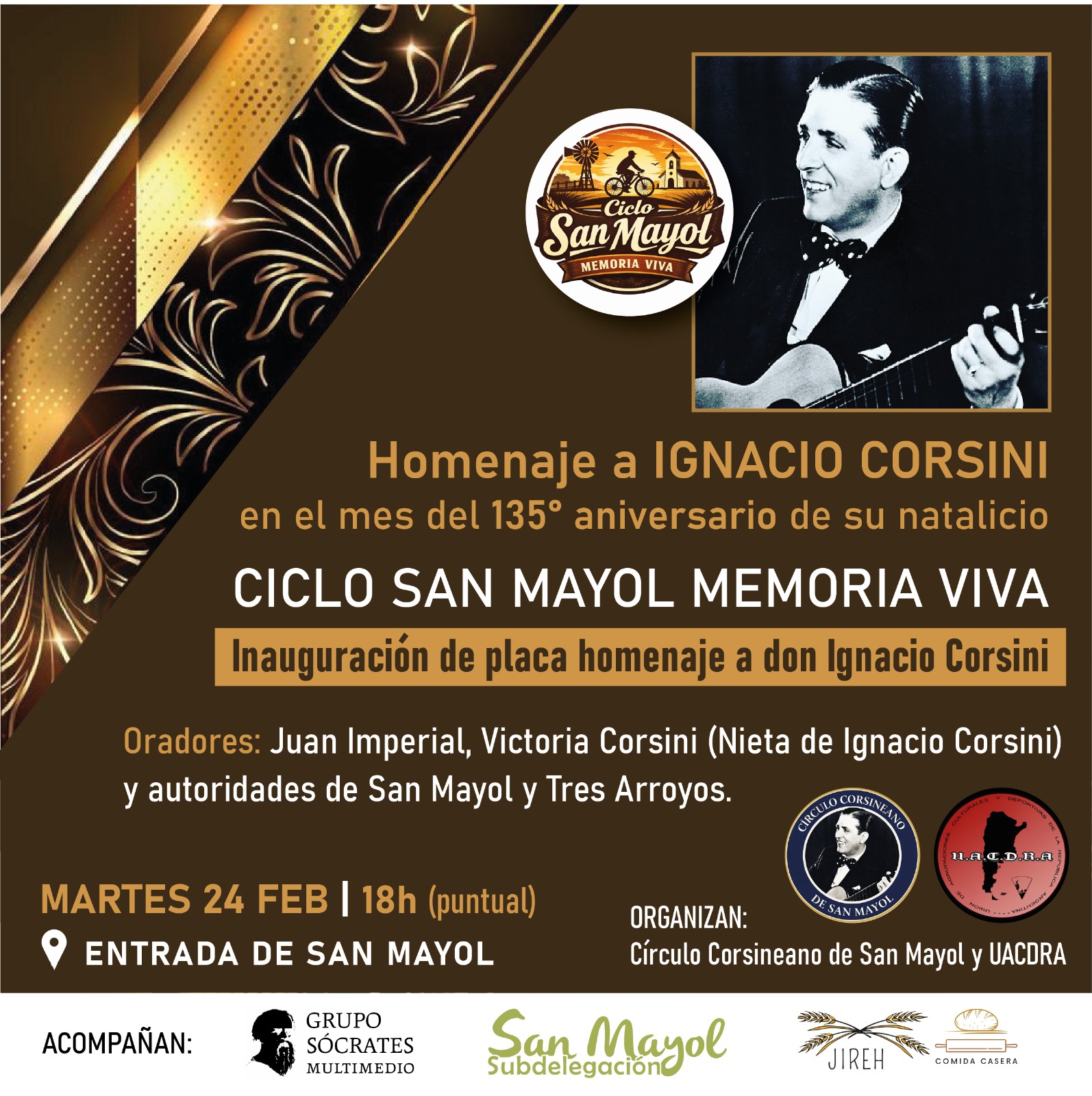3 El Círculo Corsineano de San Mayol iniciará formalmente sus actividades y UACDRA dará comienzo a su agenda cultural 2026 con una jornada de alto valor histórico y simbólico.La primera actividad conjunta se realizará el próximo 24 de febrero de 2026 en la entrada de San Mayol (Partido de Tres Arroyos, provincia de Buenos Aires), con un sentido homenaje a Ignacio Corsini, en el marco del 135° aniversario de su nacimiento.El acto consistirá en la colocación de una placa homenaje y referencia histórica dedicada al recordado “Caballero Cantor”, junto al cartel de bienvenida al pueblo inaugurado durante la gestión del actual subdelegado municipal Javier Campo Kihn.Esta jornada marcará además el inicio del Ciclo San Mayol Memoria Viva, una propuesta impulsada por UACDRA destinada a sostener vivas las memorias populares argentinas mediante homenajes a figuras destacadas de la cultura, el deporte y la identidad nacional.En el evento estarán presentes y serán oradores Juan Imperial, secretario general de UACDRA y del Círculo Corsineano de San Mayol, Javier Campo Kihn, subdelegado municipal, y Carolina Goicochea, directora de Turismo de Tres Arroyos. También contará con la destacada presencia de Victoria Corsini, nieta del ilustre cantor nacional.Ignacio Corsini nació el 3 de febrero de 1891 en Troina, Sicilia, y fue una de las figuras más importantes del canto popular argentino, junto con Carlos Gardel y Agustín Magaldi, siendo referente central de lo que se consagró como el estilo del “Cantor Nacional”. Su legado musical, atravesado por numerosas expresiones del folclore argentino, continúa vigente como parte esencial de la identidad cultural del país.Desde UACDRA destacaron que el ciclo busca afirmar la memoria colectiva, sostener las raíces culturales y reivindicar a quienes construyeron la argentinidad, entendiendo que ningún pueblo puede defender lo que desconoce ni sostenerse si olvida su historia.