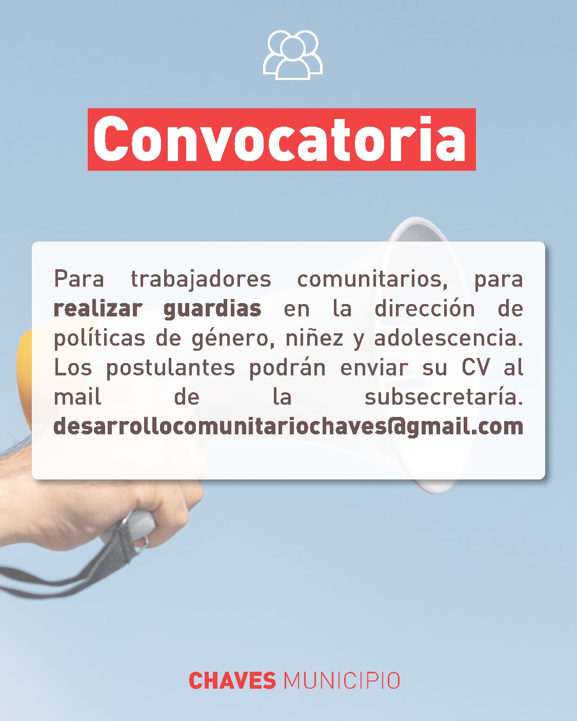 12 Chaves Municipio informa que se encuentra abierta la convocatoria para trabajadores y trabajadoras comunitarias interesados en realizar guardias en la Dirección de Políticas de Género, Niñez y Adolescencia.La iniciativa está orientada a personas con vocación social y compromiso comunitario, que deseen formar parte de los dispositivos de atención, acompañamiento y cuidado que se desarrollan desde el área.Las y los postulantes deberán enviar su currículum vitae al correo electrónico de la Subsecretaría de Desarrollo Comunitario: 📩 [email protected]Desde Chaves Municipio se continúa trabajando para fortalecer las políticas públicas de cuidado, garantizando la presencia del Estado y el acompañamiento a quienes más lo necesitan.