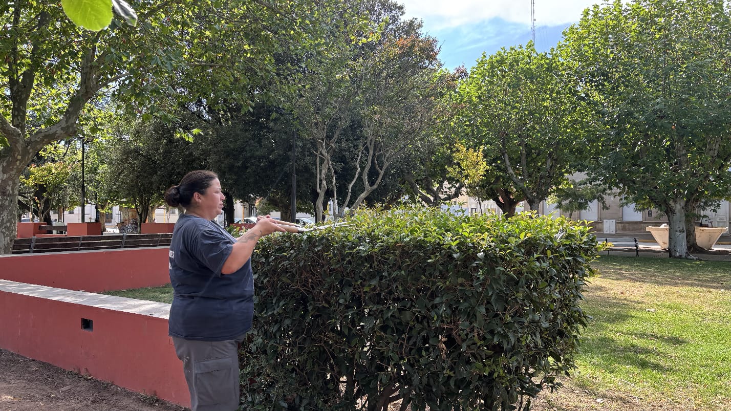 En el marco de estas tareas, se desarrollan acciones cotidianas de limpieza general, corte de césped, perfilado y mantenimiento de canteros, poda y ordenamiento del arbolado y arbustos, además del repaso de senderos y sectores de uso común, para que la plaza se mantenga en buenas condiciones durante todo el año.
