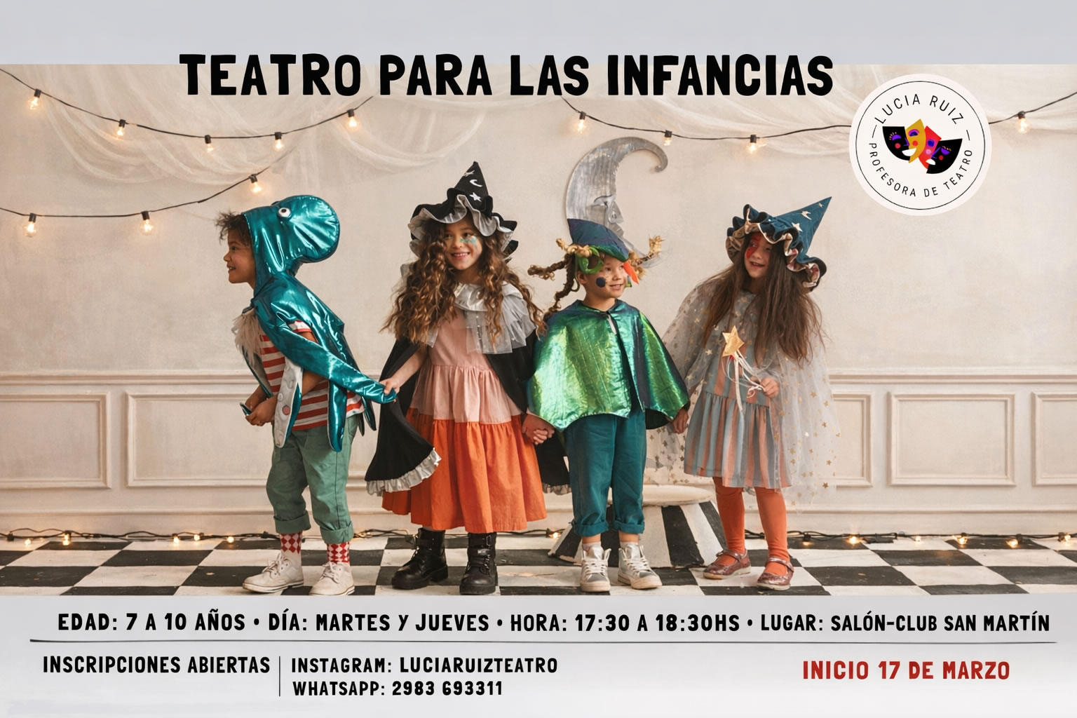 4 Se encuentra abierta la inscripción para el Taller de Teatro para las Infancias, un espacio de juego y creación destinado a niños y niñas de 7 a 10 años.A través de improvisaciones, creación de personajes y diferentes dinámicas teatrales, el taller propone estimular la expresión, la imaginación, la confianza y el trabajo en equipo, en un ambiente cuidado y respetuoso.Las clases se dictarán los martes y jueves de 17:30 a 18:30 en el salón del Club San Martín. El inicio está previsto para el martes 17 de marzo.El taller incluye materiales y una muestra final donde los participantes podrán compartir el proceso realizado.Los cupos son limitados. Para consultas e inscripciones comunicarse únicamente por WhatsApp al 2983 693311.