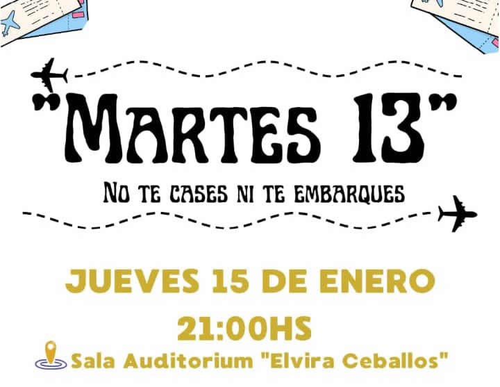 10 El próximo jueves 15 de enero a las 21:00 horas, la Sala Auditorium “Elvira Ceballos” será escenario de la obra teatral “Martes 13”, una comedia que juega con las creencias populares, el azar y los enredos que surgen cuando la superstición se cruza con la vida cotidiana.Bajo el lema “No te cases ni te embarques”, la puesta invita al público a sumergirse en una historia desopilante donde los personajes se enfrentan a situaciones inesperadas, cargadas de humor, ironía y reflexiones sobre los miedos culturales que atraviesan a la sociedad.La obra cuenta con las actuaciones de Mabel Montes, Nori Freidiaz y Juan Ustarroz, y está dirigida por Marianina Antonini, quien propone una mirada ágil y dinámica, con un ritmo sostenido que mantiene la atención del espectador de principio a fin.Las entradas se encuentran a la venta en el Centro Cultural “Georgina Valdez de Lafargue”, con un valor de $6.000 y estarán disponible a partir de mañana.La presentación forma parte de la agenda cultural impulsada por Chaves Municipio, que continúa promoviendo propuestas artísticas para el disfrute de la comunidad durante la temporada estival.